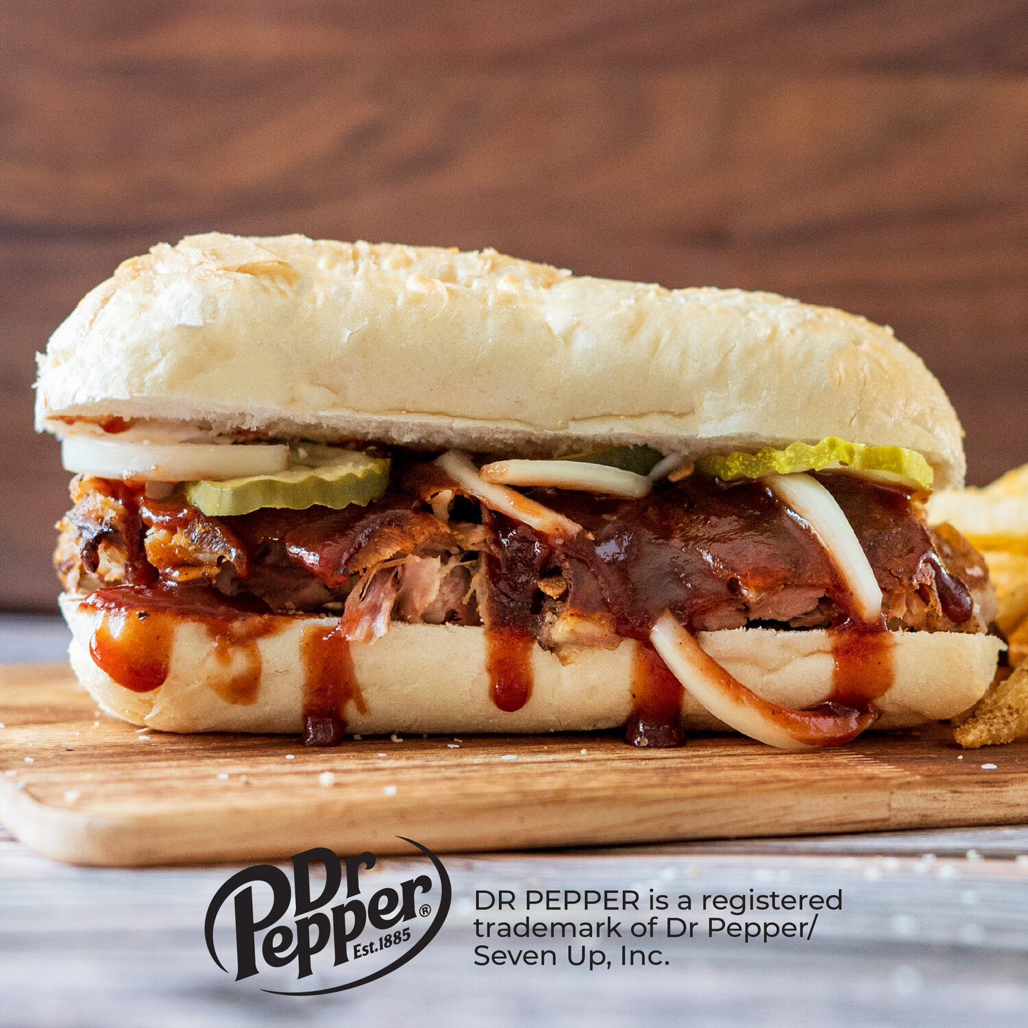 Slow smoked ribs, onions, pickles, Dr Pepper BBQ Sauce, toasted French bread, fries