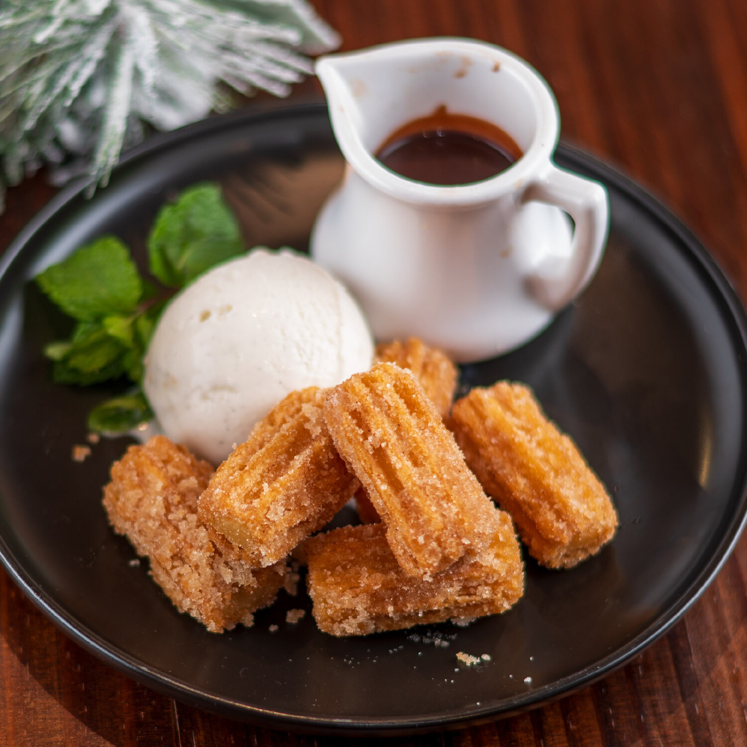 Cinnamon sugar, vanilla ice cream, beef tallow chocolate sauce