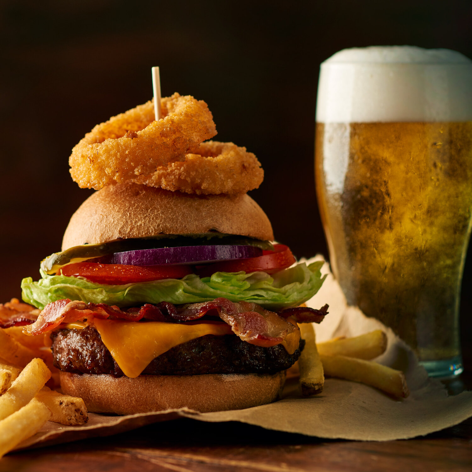 8 oz. Certified Angus Beef® patty, applewood-smoked bacon, onion rings, cheddar cheese, lettuce, tomato, onion, pickles, fries, 16 oz. Coors Banquet or soft drink