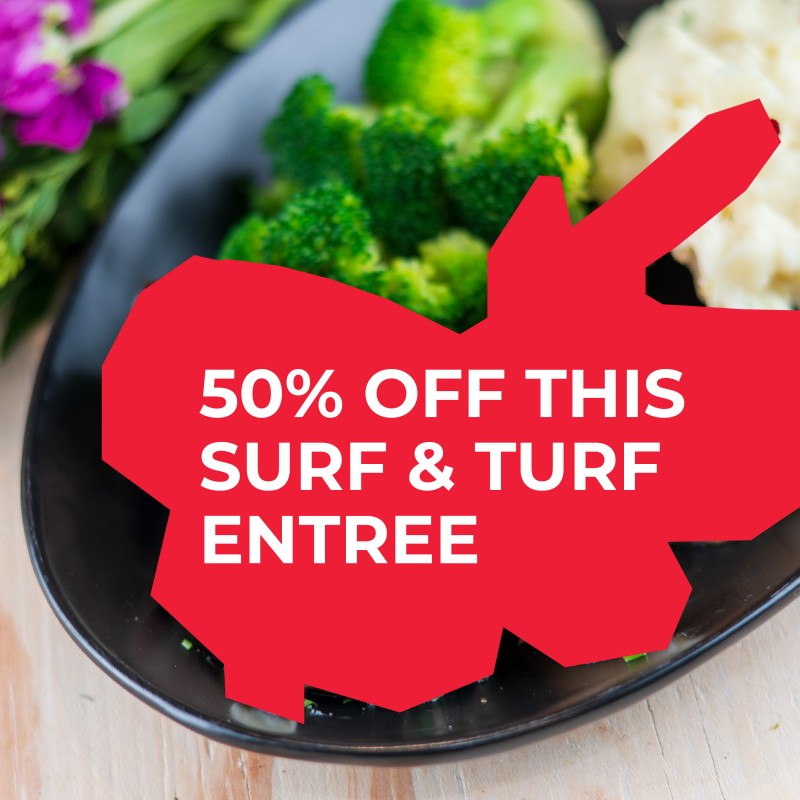 50% OFF ENTREE SPECIAL: While supplies last. CANNOT BE COMBINED WITH OTHER OFFERS, REWARDS, DISCOUNTS OR HEROES 15% OFF. 50% off entree available for dine-in only. To redeem, ask server to order the 50% off surf & turf special. Not valid for online or delivery on 3rd party platforms. Promotion subject to change without notice. Price does not include tax and gratuity. All portion weights listed are the approximate weights before cooking. Side upgrades and additions available at an additional cost. Entree special available April 1-2, 2026 only.