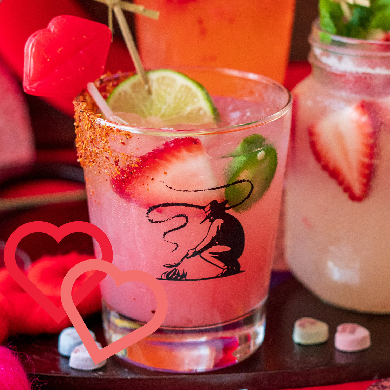 Corozon Blanco Tequila, jalapeño, strawberries, MONIN Hibiscus Syrup, fresh lime juice, jalapeño simple syrup, tajín rim, lime and lollipop garnish