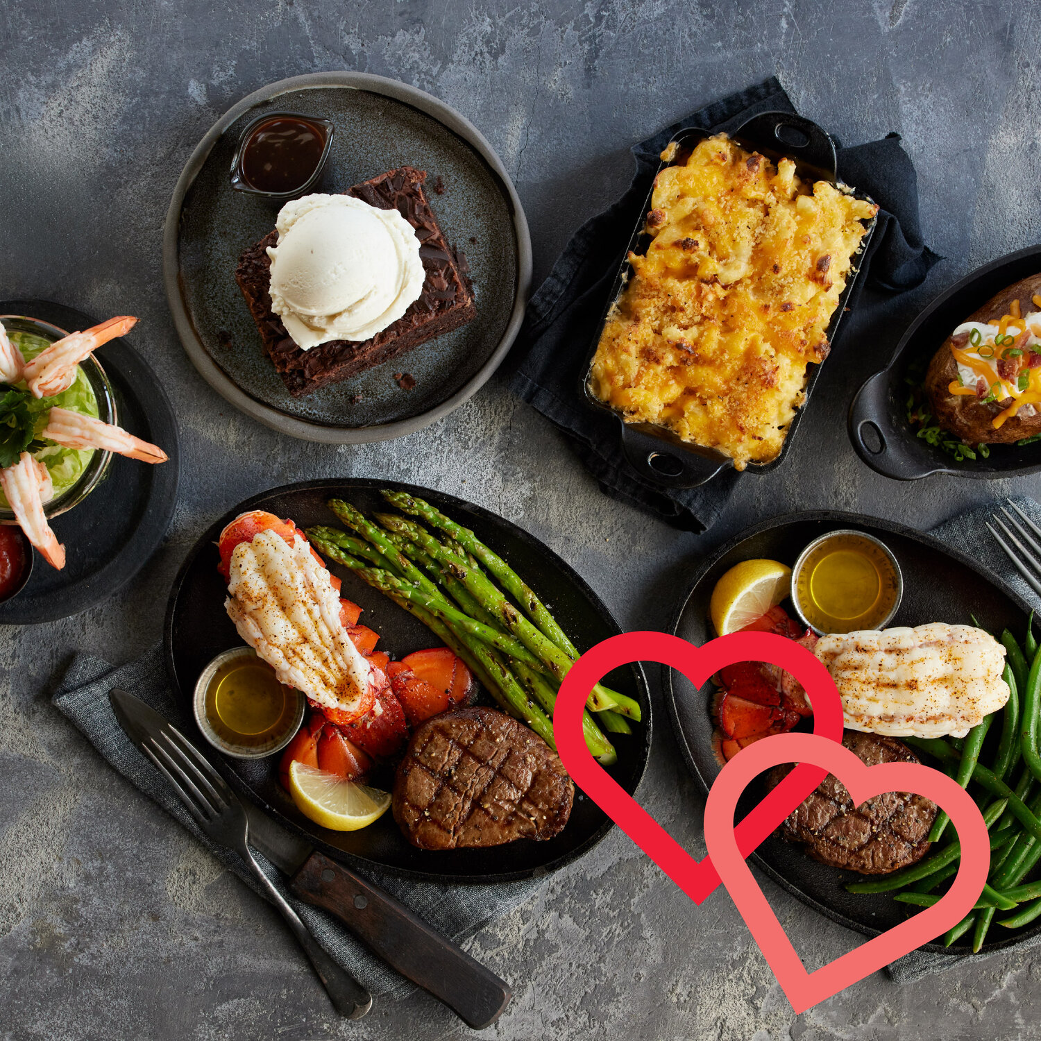 1 starter, 2 filet & lobster tail entrees, 4 classic sides, 1 dessert